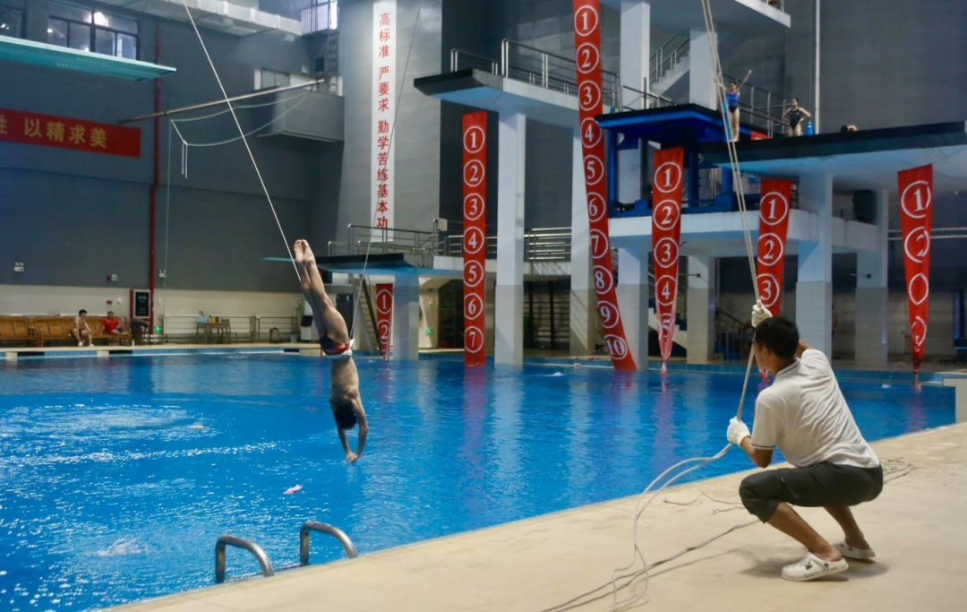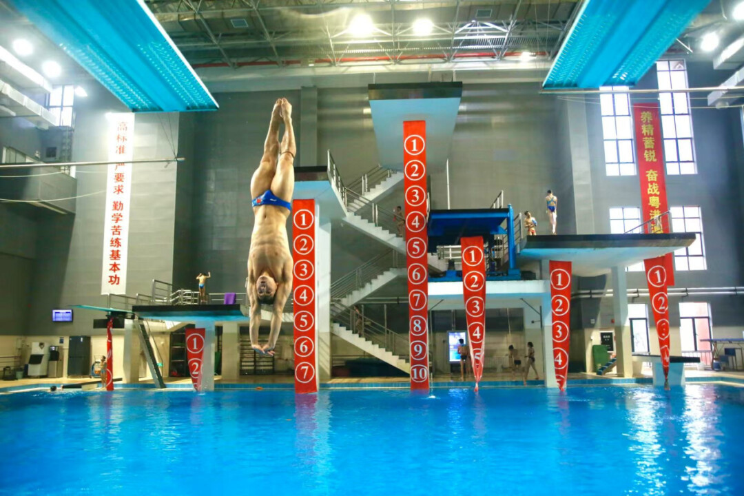 6月14日,隔绝台风“蝴蝶”的影响,在广东二沙体育训练中心跳水馆,奥运冠军谢思埸、陈艾森正带领着广东跳水队潜心备战十五运会。